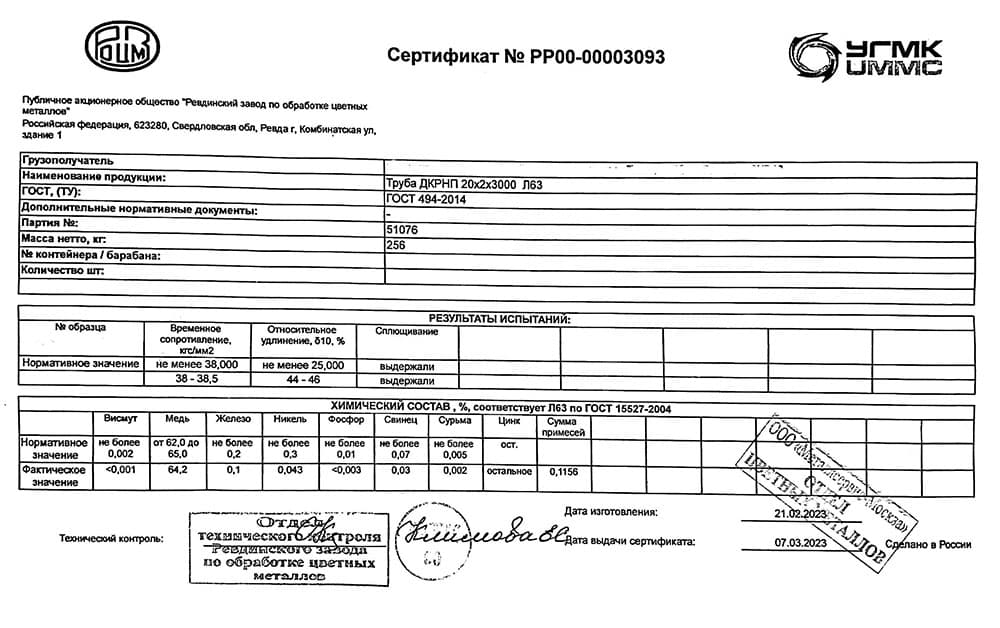 Латунные трубы по ГОСТ 494-2014, из сплавов Л63, Л68 и ЛС59-1, химический состав по ГОСТ 15527-2004. По способу изготовления делятся на холоднокатаные, тянутые и прессованные. Отбор и подготовка проб химического состава цветных металлов по ГОСТ 24231-80. Трубы общего назначения по ГОСТ 494-90, трубы тонкостенные и тянутые по ГОСТ 11383-75.